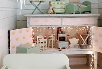 (imágenes:bolig pluss)¿Qué os parece ese aparador convertido en casa de muñecas, con guirnalda de luces y todo?¡Me chifla!