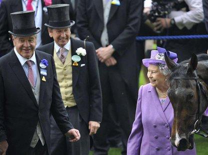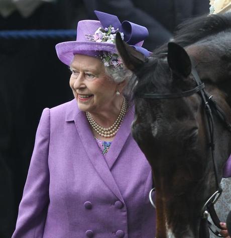 The Queen pats her horse Estimate after it wins the Gold Cup ridden by jockey Ryan Moore (left) on day three of Royal Ascot.
