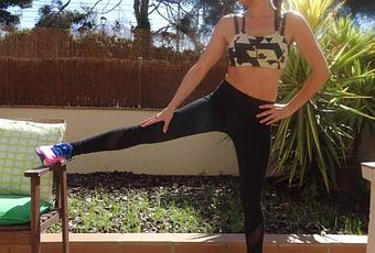 Se trata de estirar el glúteo mayor, el medio y los aductores. De lado, sube el pie en un sitio elevado como puede ser un banco, la espalda siempre recta. Si te inclinas hacia al pie estarás estirando más los aductores mientras que si intentas rotar hacia el lado contrario donde tienes el pie, estarás estirando más el glúteo mayor.