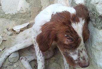 No sabemos qué le ha podido pasar a este pobre, aunque suponemos que ha sufrido un fuerte golpe provocado por un coche y ha caido en una zona llena de cristales y basura. Al parecer lleva allí todo el día sin moverse, rozando los 40º, en un estado lamentable y completamente aterrorizado, con heridas en todo su cuerpo, la cabeza ensangrentada y uno de los ojos hinchado.