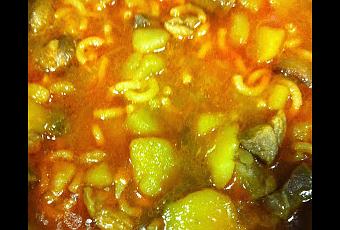 Pelamos las patatas y las cortamos a trozos , añadimos a la olla .
