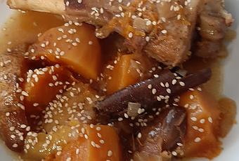 Si es en cacerola, precalentar el horno a 180 °C. Añadir 2 1/2 tazas de caldo y llevar a ebullición. Escurrir las ciruelas y las peras y agregarlas a la cacerola. Añadir la carne y los ingredientes restantes excepto las semillas de sésamo. Tapar la olla con papel de aluminio primero y con su tapa después y estofar en el horno durante 2 horas.