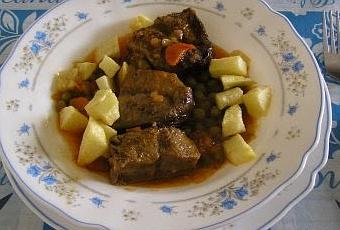Ingredientes:700 gr de carne de ternera para guisar1 cebolla3 zanahorias3 dientes de ajo2 tomates1 vasito de vino tinto150 gr de guisantes3 patatas1/2 litro de calo de carne1 pizca de pimentón1/2 cucharadita de romero seco o 1 ramita frescaaceite de olivasalpimienta