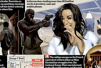 La prensa local detalló que cinco hombres armados y vestidos de policía entraron en el complejo residencial de lujo, situado en el céntrico y elegante barrio de La Madeleine. Primero maniataron al vigilante en la recepción, al que amenazaron con un arma. Tres de los asaltantes se quedaron vigilando la puerta de acceso y dos de ellos entraron en la habitación, donde la estrella estaba sola ya que su guardaespaldas no se encontraba en el edificio. Fue a su vez maniatada y encerrada en el cuarto de baño mientras sufría el robo.
