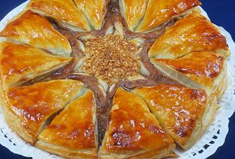 Tapar con el otro hojaldre, colocar un vaso en el centro para guiarnos mejor, y cortar en 12 porciones