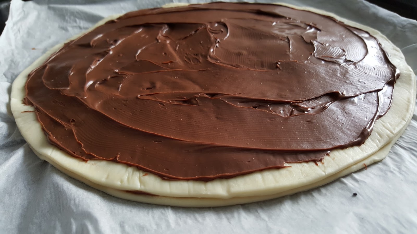 2. - Extendemos una buena parte de crema de chocolate sobre el hojaldre, sin llegar al borde del todo.