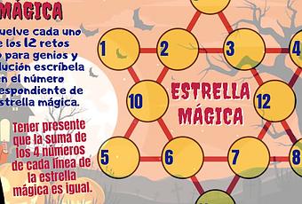 Hoy les traemos una estrella mágica matemática. Y claro que eres capaz de resolverla. Una estrella mágica matemática es una distribución de números en una estrella, de tal manera que la suma de 4 números de cada lado de la estrella, debe ser la misma, es decir que los cuatro círculos de cada lado de la estrella suman siempre lo mismo y este valor se llama constante mágica. 12 retos para jugar, pensar y desarrollar pensamiento matemático. Cada resultado debes escribirlo en el reto correspondiente.