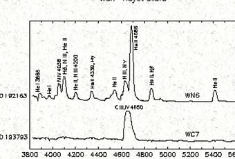 Figura: espectros de emisión de dos estrellas WR, HD 192163 es un ejemplo de una estrella WN y HD 193793 ejemplo de una estrella WC.