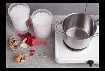 - Cuando la cera esté endurecida, sobre el fregadero pinchamos el globo con el alfiler, vaciamos el agua y los restos de globo que puedan quedar.