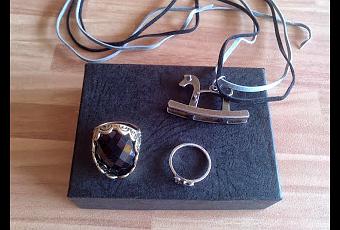 Como podéis ver aquí tengo tres joyitas nuevas:un colgante de caballito plateado,un anillo dorado con una piedra negra y una sortija plateada con un ancla y una circonita pequeña.