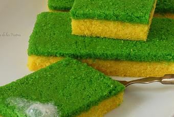 Cubrimos toda la superficie del bizcocho amarillo con la mermelada, extendiéndola bien. Colocamos encima el bizcocho verde, presionamos un poco para que se pegue. Con un cuchillo de sierra raspamos un poco la superficie del bizcocho verde para formar una capa rugosa y con aspecto áspero. Recortamos los laterales para igualarlos y cortamos piezas semejantes al tamaño de los estropajos de verdad.