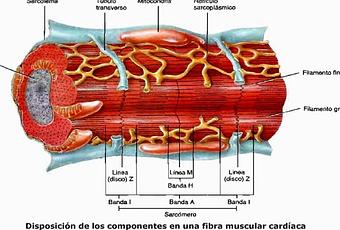 Cada fibra muscular esta formada por múltiples filamentos de miosina y actina, interdigitados entre si, que se presentan como bandas claras y oscuras (bandas A e I). El conjunto de bandas A y otra I se denomina sarcómera.