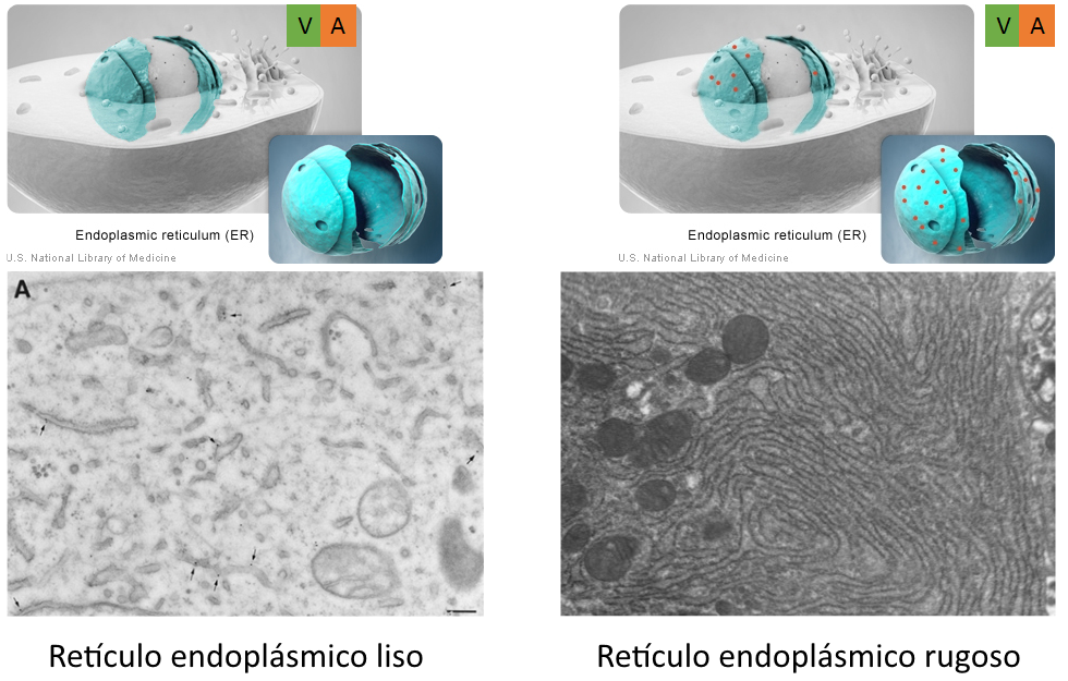 Cuando se observan células con el microscopio electrónico se aprecia que hay dos tipos diferentes de retículo endoplásmico, cada uno de los cuales tiene un aspecto y una función característicos. El retículo endoplásmico liso, constituido simplemente por tubos y bolsas de membrana, interviene en la regulación de la concentración de calcio en el citoplasma, lo que a su vez tiene gran importancia para el funcionamiento celular (por ejemplo, el cambio en la concentración de calcio provoca la contracción muscular), pero también interviene en la síntesis de lípidos, entre otros de los que forman la membrana celular y la del resto de los orgánulos. Por su parte, el retículo endoplásmico rugoso se caracteriza porque su membrana presenta, en la cara que da hacia el citoplasma de la célula, engrosamientos en forma de puntos que se han identificado como ribosomas. Esto relaciona la función de este orgánulo con la síntesis de proteínas, concretamente con las que van a formar parte de la membrana celular o van a ser exportadas hacia el resto del organismo.