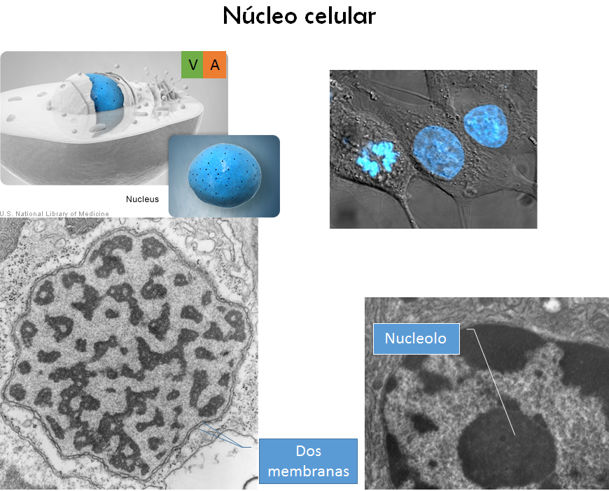El núcleo de la célula eucariota es una estructura aproximadamente esférica rodeada por bolsas aplanadas de membrana, similares a las del retículo endoplásmico. El interior del núcleo (nucleoplasma) contiene el material genético de la célula. Durante la mayor parte del tiempo, mientras la célula realiza sus actividades normales, ese material genético apenas resulta visible, apreciándose en las micrografías de mayor resolución como un hilo fino con engrosamientos distribuidos a intervalos regulares ("collar de perlas"). Eso se debe a que el ADN está totalmente estirado, permitiendo su lectura por las proteínas que interactúan con él. Además, es posible observar, en la mayoría de los casos, una zona más densa a los electrones: el nucleolo. Actualmente sabemos que se trata de una región del núcleo en la que se está sintetizando activamente el ARN que formará parte de los ribosomas. El material genético poco visible, no condensado, recibe el nombre de cromatina.