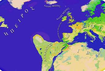 Reconstrucción paleogeográfica más extendida posible de la isla Atlantis, de acuerdo a las fuentes primarias. Llegaría por el sur hasta las islas de Cabo Verde y por el noroeste hasta las islas Azores, siendo así, todas las islas actuales, las cumbres de las regiones montañosas de la Atlántida. Al otro lado, justo enfrente, parte del continente (êpeiros) citado en el Timeo, o sea, América del Norte y Groenlandia. Georgeos Díaz-Montexano, 2001.