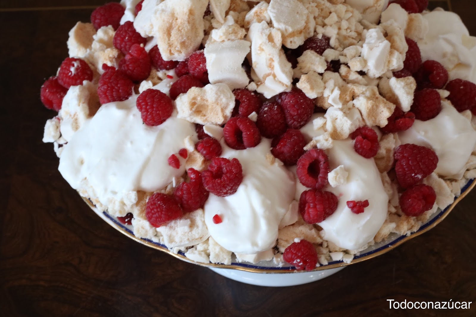 El eton mess es un postre de origen inglés consistente en una mezcla de fresas, trozos de merengue y nata, que se sirve tradicionalmente en el partido anual de críquet que se celebra el 4 de junio en el Colegio Eton contra los estudiantes del Winchester College. Esta es la definición del Wikipedia. Pero este postre con aspecto tan sofisticado es la cosa mas sencilla del mundo, que viene a ser lo mismo que una pavlova pero el merengue en este caso se pone troceado, yo no aprecio otra diferencia. Como la disciplina no es lo mío y viendo la receta del chef Ramsey he cambiado las fresas por frambuesas y para que tenga mas fruta la base está la puse completa de fruta, así cuando la sirves no es tan dulce, sino que tiene muchas frambuesas con ese toque acido que contrarresta el azúcar del merengue seco (suspiros en mi tierra Canaria).Por cierto si quieres eliminar unas pocas calorías puedes sustituir la nata por Yogurt griego.INGREDIENTES