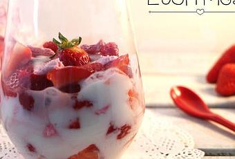 En un vaso de cristal colocamos una capa de fresas cortadas en trocitos. A continuación cubrimos con unas cucharadas de yogurt natural y rompemos encima unos merengues en trozos desiguales.