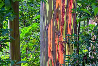 Este árbol es originario de Filipinas, Indonesia y Nueva Guinea, lo que lo hace interesante es el colorido de su corteza. Su nombre no es muy original pero lo describe perfectamente, el secreto está en como este árbol cambia su corteza a medida que va creciendo.La corteza se va renovando de manera irregular dejando salpicadas en todo el tronco, zonas que se van renovando de color verde brillante para luego ir mutando a verde más oscuro, luego a un azulado, morado, naranja y rosa. Todo esto termina en un color marrón para comenzar de nuevo la muda de su corteza con un verde brillante.Al suceder de manera irregular, en diferentes partes del tronco y en épocas distintas del año hace que el resultado sea un collage hermoso que nos alegra el día.