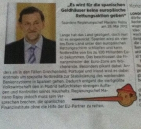 “La prensa internacional –escribe Diariocrítico bajo el título “Rajoy, el pincho de la prensa alemana”– mira a Rajoy y no le da tregua. El pasado martes, el prestigioso diario económico Handelsblatt– incluía al presidente español en su sección ‘Pinocho del día’, sección que sirve para recriminar las mentiras a los políticos. Y es que la negativa del Gobierno español a admitir el rescate levanta, cuanto menos, críticas. Así el diario reprocha los eufemismos del Ejecutivo y el empeño de Rajoy en que no habrá ‘rescate europeo de la banca española’. En concreto, el inquilino de la Moncloa afirmó en la conferencia de prensa del domingo pasado que no deseaba verse inmerso en una discusión sobre palabras. Es la tercera vez en los últimos meses que Rajoy se convierte en protagonista de la sección”.