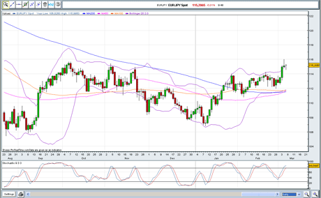 El par EURJPY se encuentra corrigiendo posiciones tras el importante rally que se produjo hacia finales de la semana pasada. El cruce se frenó el viernes en un máximo de 21 meses en los 115,9950. El nuevo escenario de tipos perfilado por el Banco Central Europeo en la reunión del jueves pasado ha sido el responsable último de este movimiento.