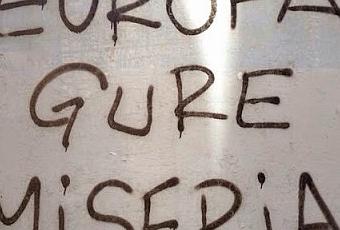 Este mensaje en Euskera que me envía Rocío de la kalea Santa María en Portugalete viene a decir lo que hoy algunos españoles y muchos vascos piensan: Europa nuestra miseria.Con las ganas que teníamos de ser europeos... ¿y ahora que lo somos, qué? Ahora nos gustaría ser alemanes, pero con sol, buen tiempo y sus euros en los bolsillos.Años atrás manaba el dinero europeo del suelo (y ahí lo hemos dejado) y ahora nos piden esfuerzos y más esfuerzos como si los españoles fuéramos capaces de esforzarnos más. Ya no podemos más y aunque pudiéramos lo disimularíamos. Podemos no volver a ganar el Mundial y la Champions (de Eurovisión no digo nada) que se nos da mejor y estamos más acostumbrados y especializados y además lo conseguimos sin esfuerzo, pero poco más. Que no nos pidan más porque la miseria está tapando el empedrado de plazas y paseos que con dinero europeo tan diligentemente invertimos o gastamos.Al español nos gusta poco obedecer, somos rebeldes con o sin causa simplemente por el echo de hacer lo que nos da la gana o no hacer lo que nos mandan y menos lo que nos imponen. ¡Que estamos hartos de Europa! que el euro nos hiper-redondeó los precios al infinito y los sueldos al finito y que no somos alemanes por mucho que nos dejemos mandar por la Sra. Merkel. Si singuen pidiendo esfuerzos a los trabajadores, jubilados y parados españoles, volveremos a ganar el mundial cada cuatro años y la Champions año sí y año también y al menos seremos felices por un día aunque miserables el resto.¡Igual es lo único que quiere Europa de España, miseria! GeolocalizaciónPor esta kalea no ha pasado el coche de Google y no podemos verla. Dejo el mapa de satélite.