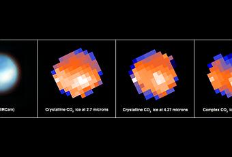 Este gráfico muestra un mapa de la superficie de Europa con NIRCam (Cámara de Infrarrojo Cercano) en el Telescopio Espacial James Webb de la NASA en el primer panel y mapas de composición derivados de los datos NIRSpec/IFU (Unidad de Campo Integral del Espectrógrafo de Infrarrojo Cercano) de Webb en los siguientes tres paneles. Los píxeles blancos corresponden al dióxido de carbono en la región conocida como Tara Regio (centro y derecha), con concentraciones adicionales dentro de porciones de Powys Regio (izquierda). El segundo y tercer panel muestran evidencia de dióxido de carbono cristalino, mientras que el cuarto panel indica una forma compleja y amorfa de dióxido de carbono. Créditos: Ciencias Crédito: Geronimo Villanueva (NASA/GSFC), Samantha Trumbo (Cornell Univ.), NASA, ESA, CSA. Crédito de procesamiento de imagen: Geronimo Villanueva (NASA/GSFC), Alyssa Pagan (STScI)