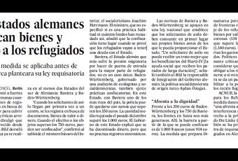 Con el recorte de prensa que adjunto quiero dar difusión a la aberrante noticia de lo que hacen algunos países con los refugiados que tienen la osadía de buscar la protección en su territorio. Algunos de los estados del sur de Alemania, al igual que ya hace tiempo que viene haciendo Suiza y en breve pretende hacer Dinamarca, registran a los refugiados a su llegada a los centros de acogida y cuando el efectivo y bienes que portan superan los 750 euros puede ser confiscado para pagar el gasto social que pueden ocasionar al estado.