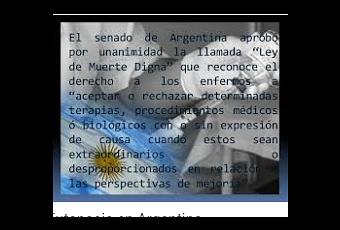 Morir dignamente,Eutanasia,práctica que se lleva a cabo en estados graves y dónde este en juego x decirlo la calidad de vida y la cuál aquí en Argentina no se practica. Muchos proyectos en torno a la ley de Eutanasia se presentaron pero no tuvieron trascendencia. En otros países como Holanda y Belgica es legal,activa y voluntaria,en Oregón EEUU esta el suicidio asistido donde el paciente se suicida con ayuda de un familiar u persona allegada,es quien termina con su propia vida.. aquí solo se contempla que un paciente se niegue a recibir tratamiento para su cura frente a una enfermedad,pero nada más…