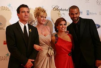 Antonio Banderas, Melanie Griffith, con un vestido en tono nude, de escote cruzado, tirantes spaguetti y lazada en la cintura, Eva Longoria y su marido, Tony Parker