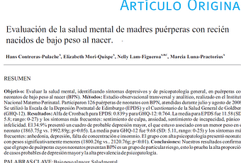 Evaluación de la Salud Mental de madres puérperas con recién nacidos de bajo peso al nacer Contreras-Pulache, H; Mori-Quispe, E; Lam-Figueroa, N; Luna-Praetorius, M. Rev. Peru. Epidemiol. 2011; 15(1):43-49