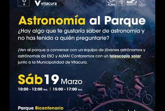 La cita para iniciar las celebraciones del Día de la Astronomía es el sábado 19 en el Parque Bicentenario, a la altura de la Municipalidad de Vitacura para encontrarse con astrónomos preparados para responder tus preguntas acerca del cosmos y observar el Sol a través de un telescopio especialmente dispuesto para la ocasión.