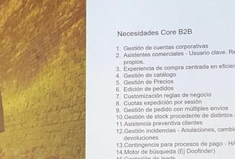 La jornada se desarrolló con ponentes de lujo empezando por Guillermo de Onestic hablando de su experiencia en proyectos de ecommerce B2B, diferencias con proyectos ecommerce B2C, factores clave, necesidades del core B2B, en resumen, de todos los factores que llevan un proyecto ecommerce B2B al éxito.