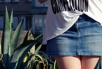 Hoy os enseño uno de mis looks casuals para el día a día. Cuando me pongo en marcha a primera hora de la mañana, busco outfits poco complicados, cómodos y que me ayuden a superar el calor, en este caso aposté por falda denim, camiseta con mensaje y zapatos blancos. El toque veraniego de color, con el clutch en aguamarina y las pulseras. ¡Espero que os guste!