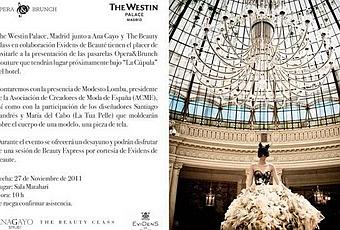 La exposición tuvó lugar en el hotel Westin Palace de Madrid, allí se realizó la presentación a prensa del Opera & Brunch Couture, los desfiles de alta costura en la cúpula del hotel con opera de fondo. Y uniendose con el lujo, la alta costura y el buen hacer, Evidens de Beaute realizo el nuevo tratamiento Kit Peeling Nueva Piel, donde las periodistas y asisitentes pudieron probar en su propia piel la experiencia. Se hicieron sesiones de Belleza Flash que dejarón encantadas hasta las más exigentes.
