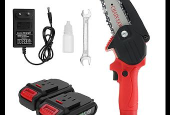-La maquinaria eléctrica es mucho menos pesada al no disponer de depósito para combustible.-La maquinaria eléctrica es más respetuosa con el medio ambiente.-El gasto en electricidad es menor que en combustible.Podemos encontrar aradoras, aspiradores, motosierras, astilladoras, trituradoras y máquinas para mulching, cortabordes, cortadoras de troncos, cortasetos y limpiadoras de presión entre otras maquinarias eléctricas.Hace poco he descubierto la mini motosierra eléctrica. Una máquina parecida a un taladro de batería, pero con una espada de motosierra de 4 pulgadas. Normalmente se pueden encontrar con baterías de 21-28V y con una capacidad media de trabajo de 1,5 a 2,5 horas. No dispone de depósito de aceite para engrasar la cadena de corte con lo que se aconseja lubricar cada cierto tiempo en uso. Esta máquina puede cortar en segundos ramas de 4-5 cm de diámetro y además es muy ligera pues su peso está en torno a un kilo.