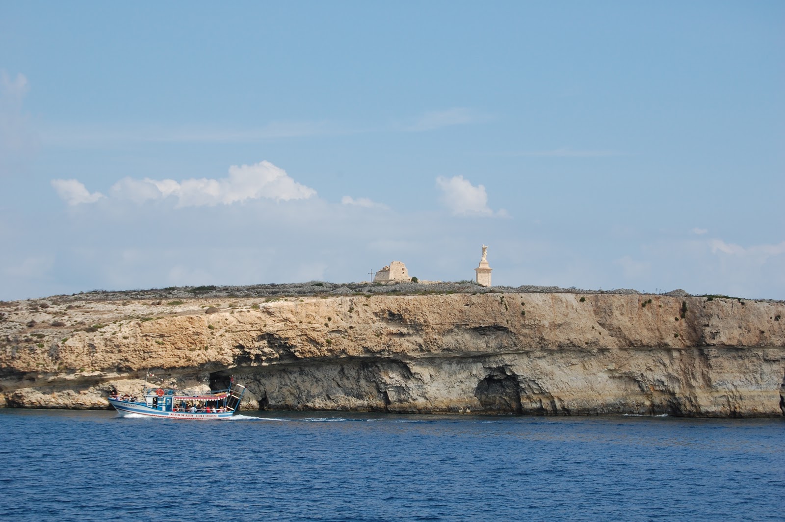 Nos estamos acercando a la isla de Comino, de tan sólo 3,5 km cuadrados, en la que existe un único hotel. Desde el barco observamos la Torre de Santa María. Fue construida por los Caballeros Hospitalarios en 1618, con funciones defensivas. Tiene planta cuadrada con cuatro torretas en las esquinas.