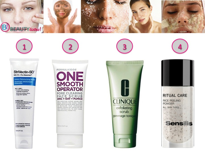 1. SD Instant Retesturizing Scrub de la Linea de StriVectinEste exfoliante es para mí el producto estrella. Es sin duda el mejor exfoliantes que he probado. Tiene una doble funcion, por un lado retira en profundidad las celulas muertas de la piel dejandola súper limpia y suave y por otro lado tiene ingredientes activos que ayudan a aclarar las manchas de la cara, las pecas, proporciona a la piel una luminosidad increible y para mi ha sido un gran descubrimiento. Se suele usar de 2 a 3 veces por semana aunque yo suelo usarlo mas ya que me maquillo a diario y siento que a veces se acumula mucha suciedad en la piel. El unico inconveniente es el precio, es algo caro, el bote de 100 ml cuesta unos 30€ aproximadamente aunque es verdad que si lo usas dos o tres veces por semana puede durarte mas de seis meses.2. One Smooth Formula 10.0.6 Este exfoliante puede usarse a diario sin miedo, porque es muy suave y aunque arrastra la suciedad y la elimina, su textura es parecida a la gelatina y hace que la exfoliacion sea agradable. Tiene un perfume afrutado muy bueno y de esta misma linea hay otros productos geniales. Es una linea exclusiva de venta en Sephora y la verdad es que me encanta. Su precio es muy bueno, creo que no llega a los 10€ y la verdad es que lo recomiendo. Eso si, su microabrasion no es agresiva asi que a las que os guste sentir las particulas en la cara, con este exfoliante es complicado. 3. Exfoliating scrub gommage tonique de CLINIQUEEste exfoliante es como una especie de mascarilla de arcilla blanca, su textura es espesa pero fácil de aclarar y de retirar. Está especialmente indicado para pieles mixtas y grasas.El resultado es una piel limpia, suave y luminosa. Contiene mentol por lo que además deja una sensación de frescor en la cara muy agradable. Lo ideal es usarlo un par de veces por semana.El envases es de 100 ml que cunden muchísimo y el precio puede oscilar entre los 20-30€ dependiendo donde lo compreis.4. Rice peeling powder de SENSILISEste exfoliante tiene una innovadora textura en polvo que permite personalizar la exfoliacion.Su fórmula contiene partículas de arroz, coco y aceite de palma. Deja la piel muy limpia y luminosa. Sus partículas son más grandes que en otros exfoliantes.Para una exfoliación intensa hay que aplicarlo directamente sobre la piel húmeda o mezclando una pequeña cantidad con agua creando espuma y aplicarlo sobre el rostro y el cuello. En cambio si prefieres una exfoliación más suave podéis mezclar el producto con crema limpiadora.Está indicado para todo tipo de pieles y lo ideal es usarlo 1 ó 2 veces por semana. El envase es de 30 ml y su precio va desde los 17€ a los 24€