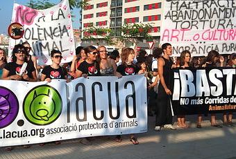 La protectora Lacua convocó una manifestación en Alzira para protestar contra los eventos taurinos programados para la próxima semana, y que han sido incorporados por primera vez este año, dejando de lado los tradicionales conciertos en las fiestas patronales. La protectora de animales Ribercan y AnimaNaturalis adhirieron a esta convocatoria.