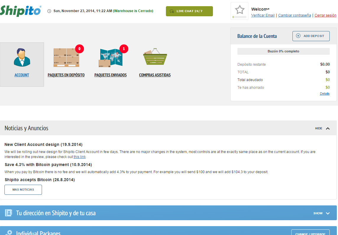 Tengo que añadir que en todo momento Shipito te va informando de la verificación de tus datos, pago de tu depósito, el envío de tus direcciones, cuándo se recepciona el paquete, cuando se envía...en ese aspecto está genial y muy bien gestionado. Además, cuando accedes con tu correo y tu contraseña aparecen tus paquetes en depósito, los enviados, todos tus datos, tus direcciones...todo se ve perfectamente y de forma muy ordenada. De todas formas aquí tenéis las preguntas y respuestas más frecuentes. Incluso te pueden asistir en las compras si no sabes hacerlas y te pueden conseguir una tarjeta de crédito con dirección en EEUU.