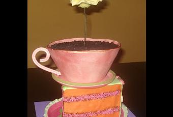 La taza viene a ser la tarta, la parte comestible; la porción de tarta que está debajo es un dummie o tarta falsa, es una opción muy interesante para hacer ciertos diseños de tartas, sin tener que hacer tarta para 40, 50 o 100 si en realidad se quiere para bastante menos personas.