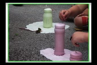 Se llena medio frasco con el vinagre , un chorro de lavavajillas y colorante (que se consiga mucho color) se remueve un poco . Luego se echa una cucharada de bicarbonato y Tachánnnnn, empieza a salir un montón de espuma de color. Se les queda una carita, probarlo.