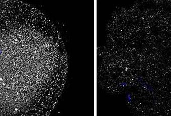 Para la fertilidad de las mujeres resulta esencial que tengan versiones sanas del BRCA1. Los oocitos de mujeres de entre 24 y 35 años, a la izquierda, contienen niveles más altos de BRCA1, en gris, que los oocitos de mujeres de entre 36 y 41 años, a la derecha. (Imagen: "Impairment of BRCA1-Related DNA Double-Strand Break Repair Leads to Ovarian Aging in Mice and Humans", Shiny Titus et al. Sci Transl Med 5, 172ra21 -2013-; DOI: 10.1126/scitranslmed.3004925)