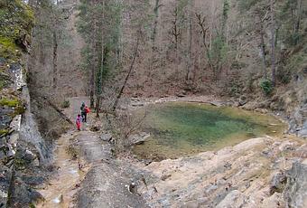 Seguimos avanzando hasta llegar al Gorg Verd y al Salt del Molí, un pequeño salto de agua artificial. En este punto, hay un tramo equipado con un par de cuerdas que permiten descender al cauce del río. Es importante tener precaución, ya que, si el terreno está mojado, puede resultar muy resbaladizo.