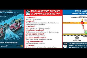 El domingo 8 de septiembre se realizará la 13ª edición de Expo Auto Argentino 2024. La muestra anual, de los autos históricos argentinos, se podrá visitar desde las 10 horas, hasta las 18 horas. El predio está ubicado, al lado del Club de Campo La Tradición, en la intersección de la Ruta Provincial 7 y José Miró, en la localidad de Francisco Álvarez, partido de Moreno, provincia de Buenos Aires.
