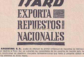“Isard exporta prestigio”, dice un eslogan dentro de la pieza gráfica. En el texto se menciona que como se había satisfecho la demanda de repuestos en el mercado argentino, se realizó esta exportación a Perú.