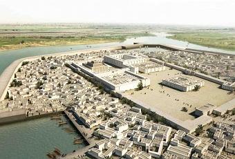 Reconstrucción virtual de la ciudad de Ur, tal y como podía aparecer a finales del III milenio, situada en un paisaje marismeño, rodeada por el río Eúfrates y un canal artificial. Se incluyen los dos hipotéticos puertos fluviales cercanos al recinto sagrado dedicado al dios lunar Nanna o Nannar. Fuente: Folleto de la Exposición.