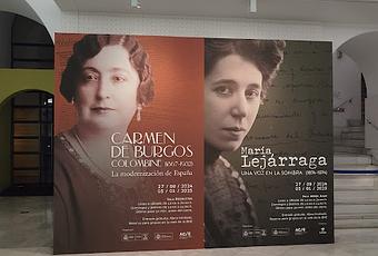 La primera expo es la dedicada a Carmen de Burgos, sobre fondo rojo teja los vinilos con letra blanca nos cuenta su vida y obra acompañándola con retratos, libros, periódicos y facsímiles de algunos de sus artículos, como los que se pueden apreciar en algunas de las siguientes fotos.