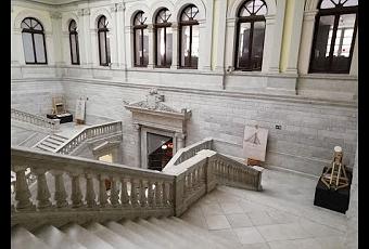 Además de los libros, a lo largo de las escaleras había varias de las máquinas que diseñó a tamaño real, y la cabeza y las patas del inmenso caballo que diseñó para hacer una estatua ecuestre gigante que, tristemente, nunca se llegó a fundir en bronce.