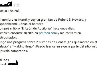 Me quedé de piedra, y mi agradecimiento hacia él ya fue enorme. Joder, este apoyo era una pasada: un lector que ya no es que no me conozca, es que ni siquiera es de mi país y habla otro idioma apoyándome en la idea. El tiempo ha pasado y ha recibido sus correspondientes textos de Conan (es de los pocos lectores que ha leído todo lo que tengo guardado en el cajón).