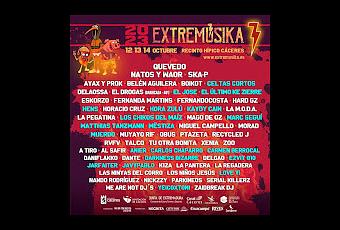Entre el 12/10 y el 14/10 en el Recinto Hípico de Cáceres con un cartel muy interesante, vuelve el Extremúsika. Como grandes nombres, Celtas Cortos, Matthias Tanzmann, El Último Ke Zierre y Hora Zulú junto a Marc Seguí y Mëstiza. No olvidamos a nombres como Los Chicos del Maíz, Muerdo, JaviPablo o El Drogas (Barricada - 40º), La M.o.d.a., Talco, La Pegatina, Obus, Boikot, Eskorzo o Miguel Campello entre otros.